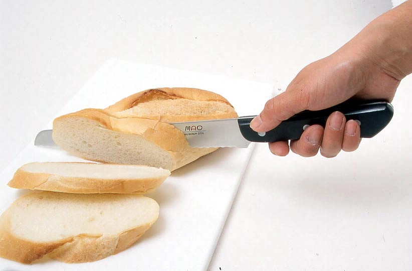 Japonský plátkovací nůž se zoubkovaným ostřím MAC Chef BS-90 s pevnou čepelí 220 mm je ideální na krájení chleba a pečiva. Vroubkované ostří snadno proniká křupavou kůrkou pečiva, croissanty, sendviči i bagetami, které je potřeba nakrájet s přesnosti a lehkosti. Využití najdete i při krájení ovoce jako například velké melouny, ananasy nebo při plátkování pomeranče či citrónu. Řezy budou čisté a přesné! Zoubkované ostří navíc nepotřebujete brousit jako jiné nože a svoji ostrost si uchovává v podstatě po celou dobu jeho používání.